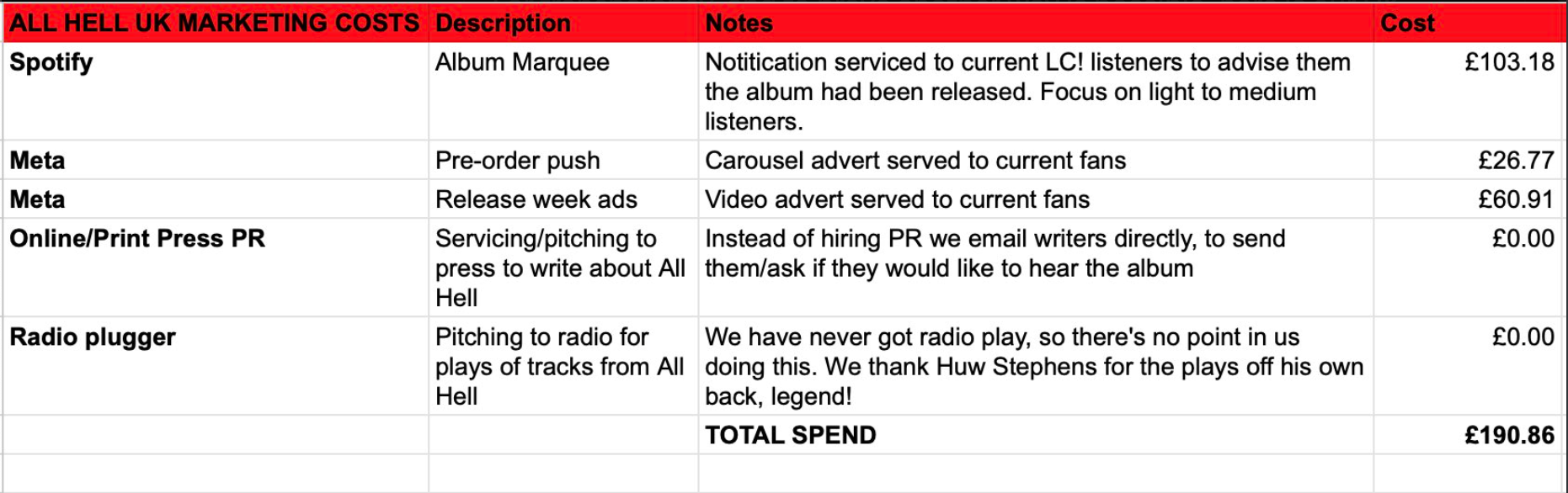 Today, the band posted a spreadsheet of their marketing costs, and every other artist in the Top 40 should be reaching out to their representation to see just what all those big budgets are for.